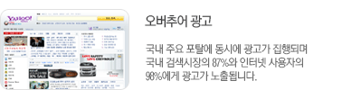 • ¿À¹öÃß¾î ±¤°í - ±¹³» ÁÖ¿ä Æ÷Å»¿¡ µ¿½Ã¿¡ ±¤°í°¡ ÁýÇàµÇ¸ç ±¹³» °Ë»ö½ÃÀåÀÇ 87%¿Í ÀÎÅÍ³Ý »ç¿ëÀÚÀÇ 98%¿¡°Ô ±¤°í°¡ ³ëÃâµË´Ï´Ù. ÀÚ¼¼Èñº¸±â
